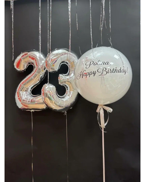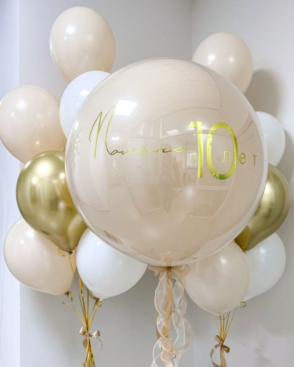 - Крупный размер — около 60 см. Стоимость составляет примерно 2200 рублей. Этот размер позволяет размещать большие надписи, фотографии, использовать широкие ленты, фатин и мини-фигурки.